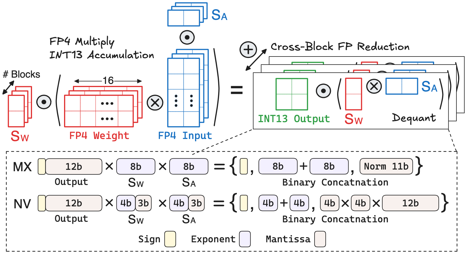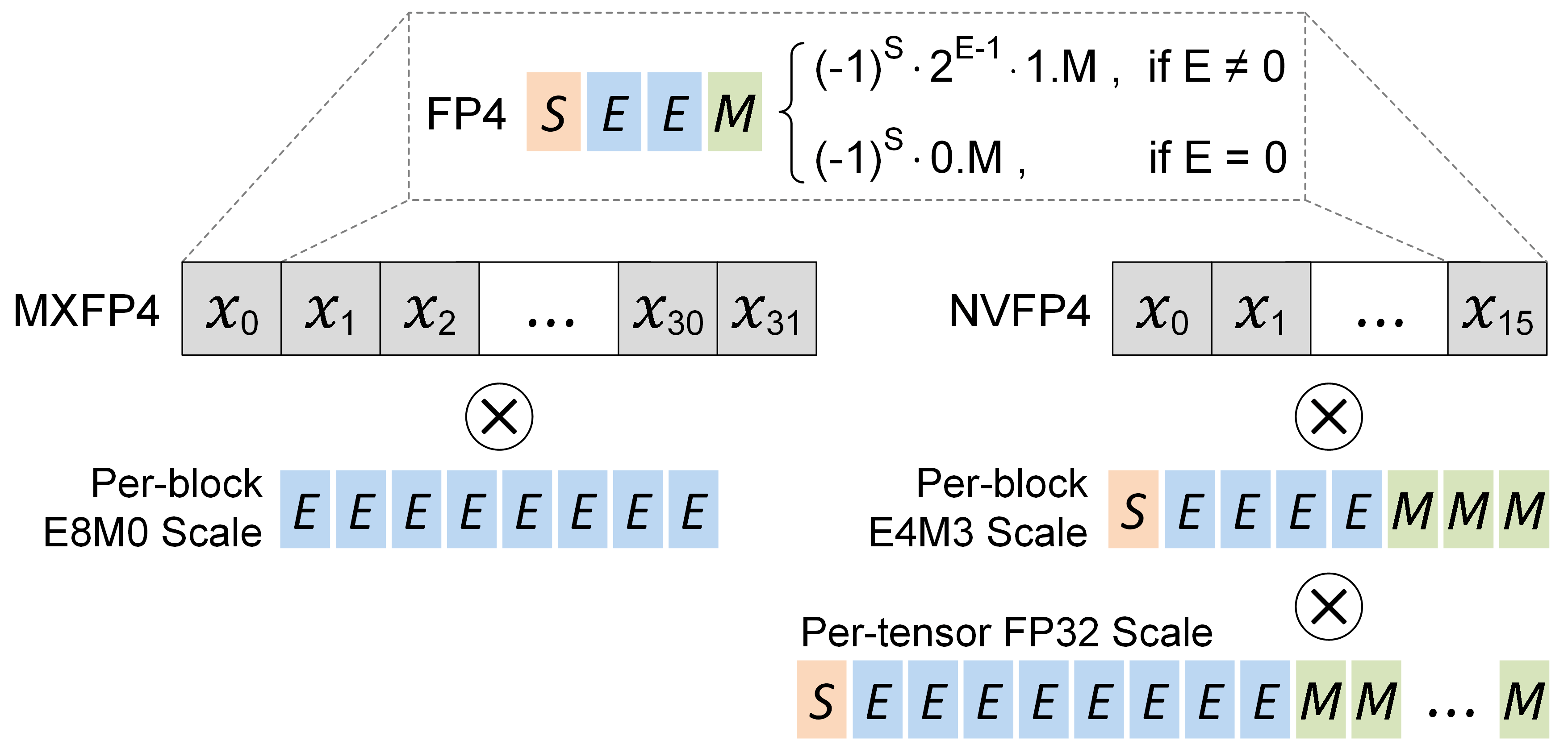 The question is: How can we reduce the cost of scale factors? The answer is surprisingly straightforward: if quantization can reduce the memory and computation costs of tensor elements, why not apply it to scale factors? Building on this idea, the industry has proposed two methods to quantize the block scale factor: Microscaling (MX) and NVIDIA’s (NV) approach. Both quantize the scale factor to 8 bits, but using different number representations