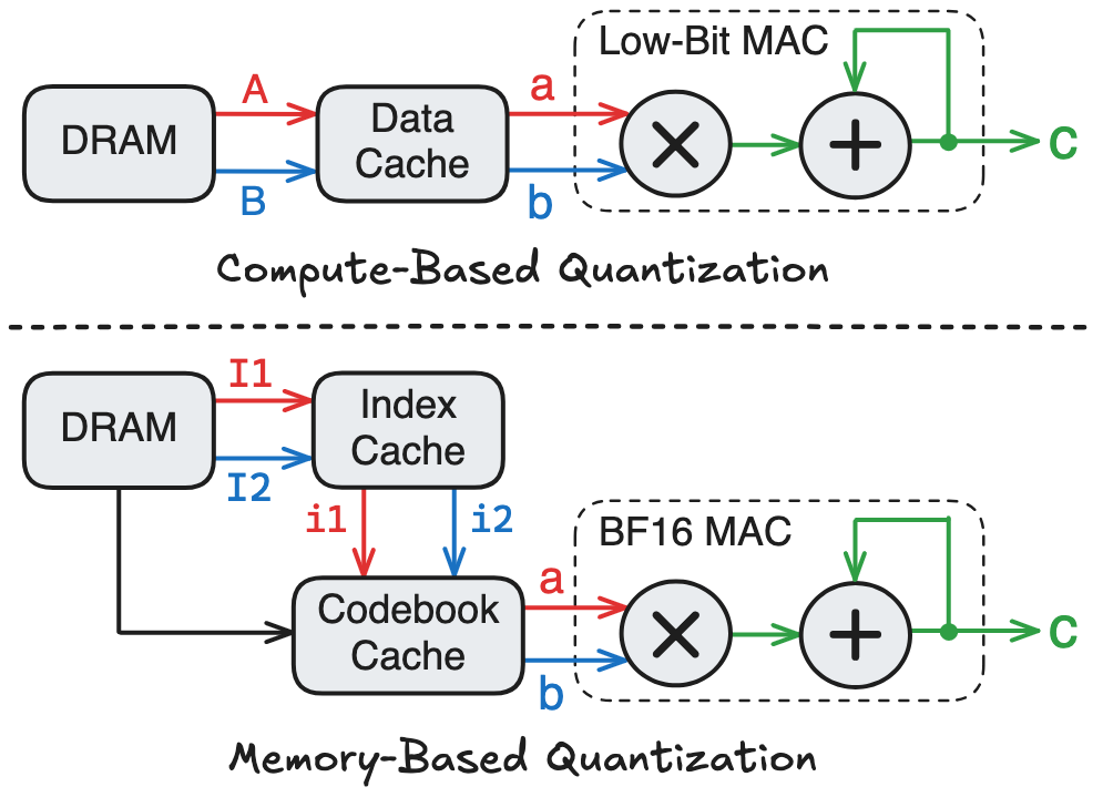 Compute-based quantization enables computation on low-bit MAC hardware, whereas memory-based quantization requires an additional memory access to the codebook cache before performing computation on BF16 MAC hardware. Hence, at the same model compression ratio, compute-based quantization typically consumes significantly less area and energy, making it the favorable approach in modern LLMs
