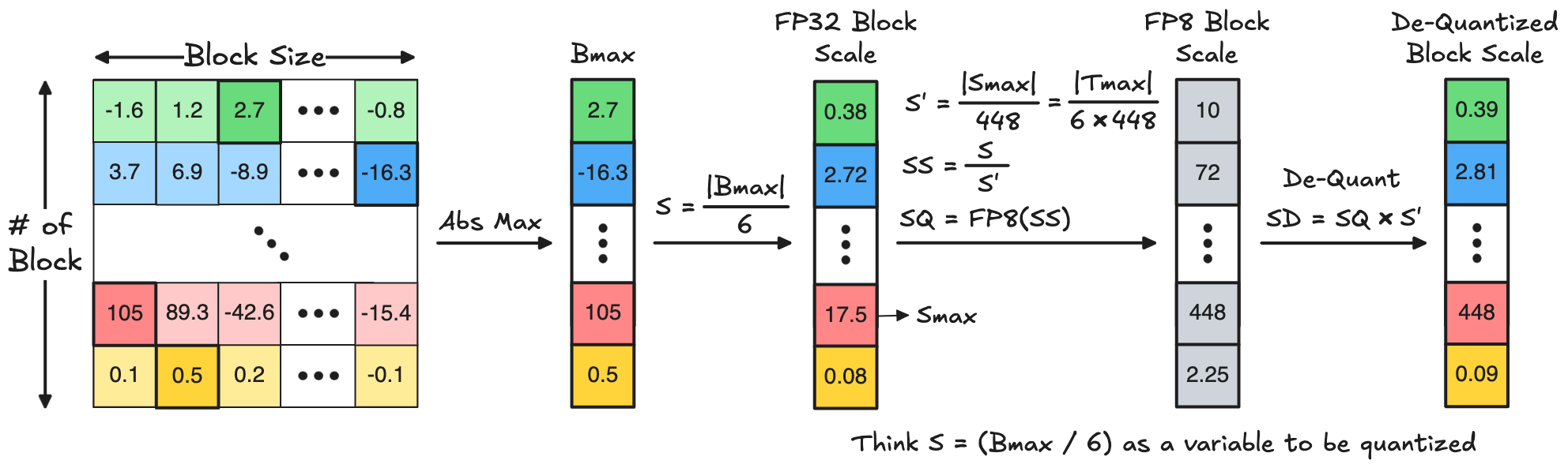 \[\begin{aligned} &\mathrm{S} = \frac{ |\mathrm{B}_{\text{max}}| }{ \mathrm{Q}_{\text{B,max}} } \\[0.3em] &\mathrm{S'} = \frac{ \mathrm{S}_{\text{max}} }{ \mathrm{Q}_{\text{S,max}} } = \left(\frac{ |\mathrm{B}_{\text{max}}| }{ \mathrm{Q}_{\text{B,max}}}\right)_{\text{max}} \cdot \frac{1}{\mathrm{Q}_{\text{S,max}} } = \frac{|\mathrm{B}_{\text{max}}|_{\text{max}}}{\mathrm{Q}_{\text{B,max}}} \cdot \frac{1}{\mathrm{Q}_{\text{S,max}}} = \frac{|\mathrm{T}_{\text{max}}|}{\mathrm{Q}_{\text{B,max}} \cdot\mathrm{Q}_{\text{S,max}}} \\[0.3em] &\mathrm{S_\mathrm{S}} = \frac{\mathrm{S}}{\mathrm{S'}} \\[0.3em] &\mathrm{S_Q} = \texttt{Round}\left(\,\mathrm{S_\mathrm{S}}\,,\, \text{FP8}\,\right) \\[0.3em] &\mathrm{S_\mathrm{D}} = \mathrm{S_Q} \cdot \mathrm{S'} \end{aligned}\]where \(\mathrm{Q}_{\text{B,max}}\) is the maximum quantization value for the block element, \(\mathrm{Q}_{\text{S,max}}\) is the maximum quantization value for the block scale (i.e., \(448\) for FP8), \(\mathrm{S}'\) is the scale of block scale, \(\mathrm{T}_{\text{max}}\) is the tensor maximum, \(\mathrm{S_{S}}\) is the scaled block scale, \(\mathrm{S_{Q}}\) is the quantized block scale, and \(\mathrm{S_{D}}\) is the final dquantized block scale. This block scale quantization process is exactly the same as how we quantize a tensor as discussed in Section-III.2. The mathematical equations are therefore also the same as those for tensor quantization, except that we change \(\mathrm{X}\) to \(\mathrm{S}\), \(\mathrm{S}\) to \(\mathrm{S'}\), and \(\mathrm{Q}\) to FP8. Below is a visualization to help you understand the FP8 block scale quantization using the popular NVFP4 format (i.e., \(\mathrm{Q}_{\text{B,max}}\) = 6) as an example.