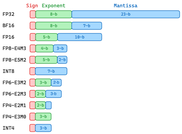 Floating-point representation is the default number system used in deep learning training and inference, usually under 32-bit or 16-bit precision to ensure numerical stability and accuracy. A standard floating-point representation is characterized by three components: Sign (S), Exponent (E\(), Mantissa (M\)). Since the sign always has a single bit, a floating-point representation with \(\mathrm{x}\)-bit exponent and \(\mathrm{y}\)-bit mantissa is often called \(\mathrm{\mathbf{ExMy}}\), which has the following binary pattern and decimal value: