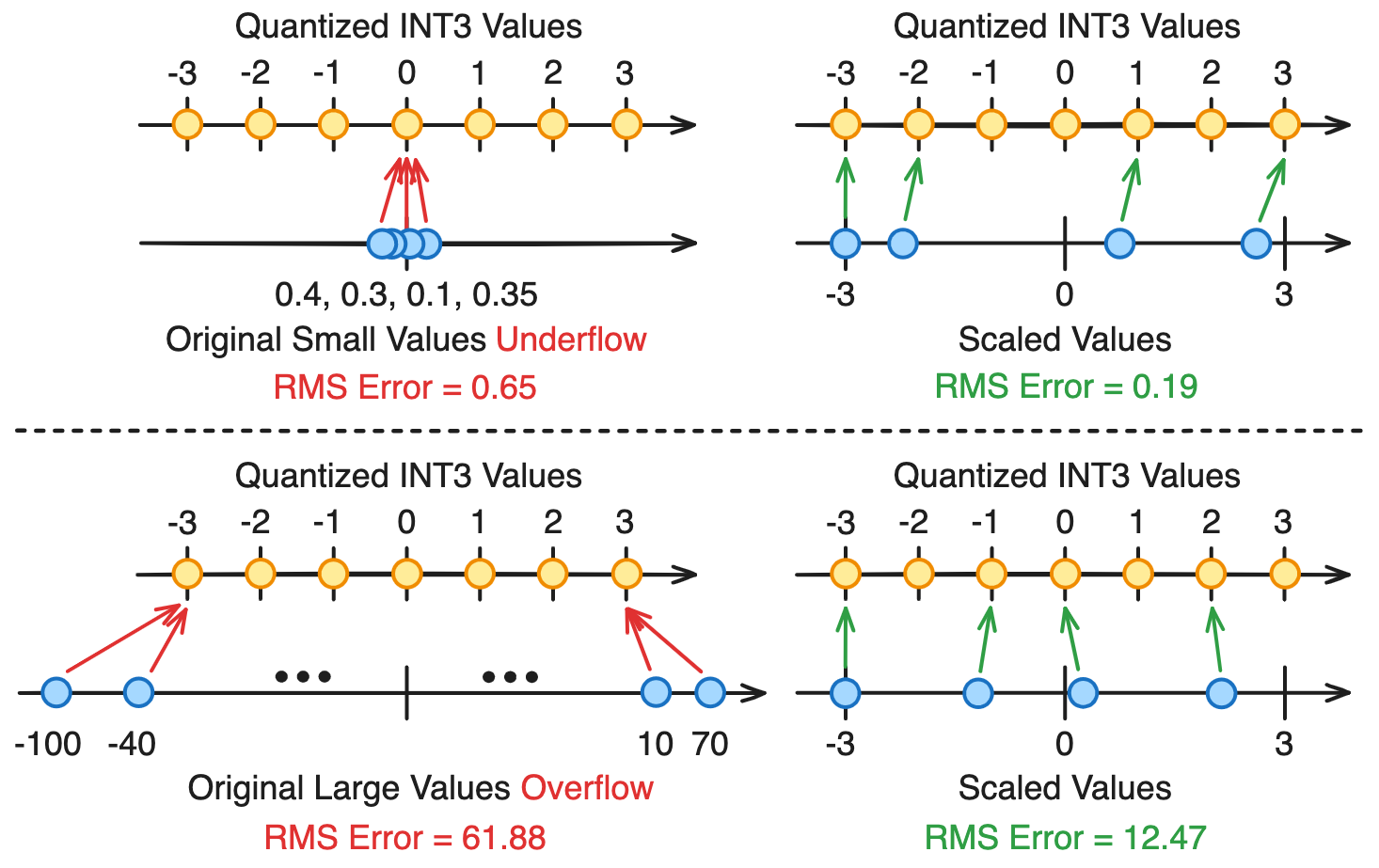The above example quantizes a tensor of four elements to the 3-bit sign-magnitude integer (INT3) representation, and measures the resulting root-mean-square (RMS) quantization error. As shown in the top-left figure, if the original tensor contains very small values that are close to zero, directly casting to INT3 will make all values underflow to zero, resulting in catastrophic information loss. Similarly, as shown in the bottom left-figure, if the original tensor contains very large values that overflow the INT3 range, directly casting to INT3 will clamp these large values to the endpoint of INT3, resulting in significant saturation error.