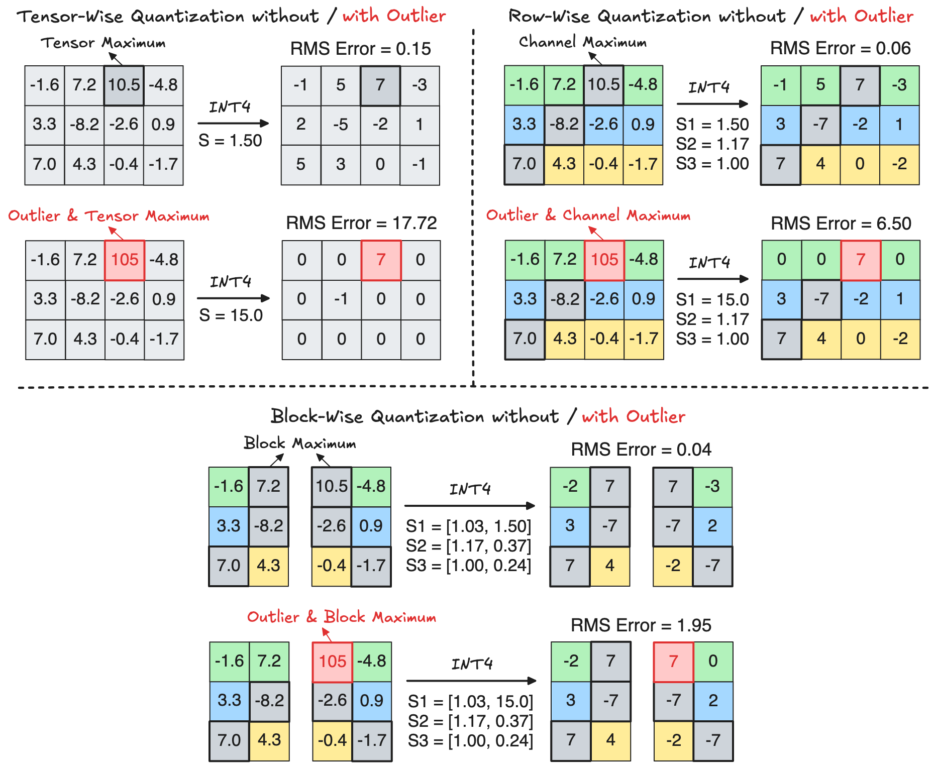 Quantization granularity measures how many elements are scaled and quantized together. For example, the coarsest quantization granularity is simply Tensor-Wise Quantization. But at this granularity, even a single outlier can significantly squeeze most of the remaining values, making them underflow to zero after quantization. This phenomenon is visualized in the following top-left figure, which uses INT4 sign-magnitude representation to quantize a \(3\times4\) tensor. To mitigate the impact of outliers, we can reduce the quantization granularity so that fewer values are quantized together. For example, Row-Wise Quantization applies independent scaling to each row of a tensor, limiting the effect of an outlier to values within the same row, as illustrated in the following top-right figure. On top of row-wise quantization, the granularity can be further reduced by partitioning each row into smaller segments / blocks, an approach called Block-Wise Quantization, which further constrains the impact of outliers to a small block. This is illustrated in the following bottom figure, where a row is partitioned into two blocks: