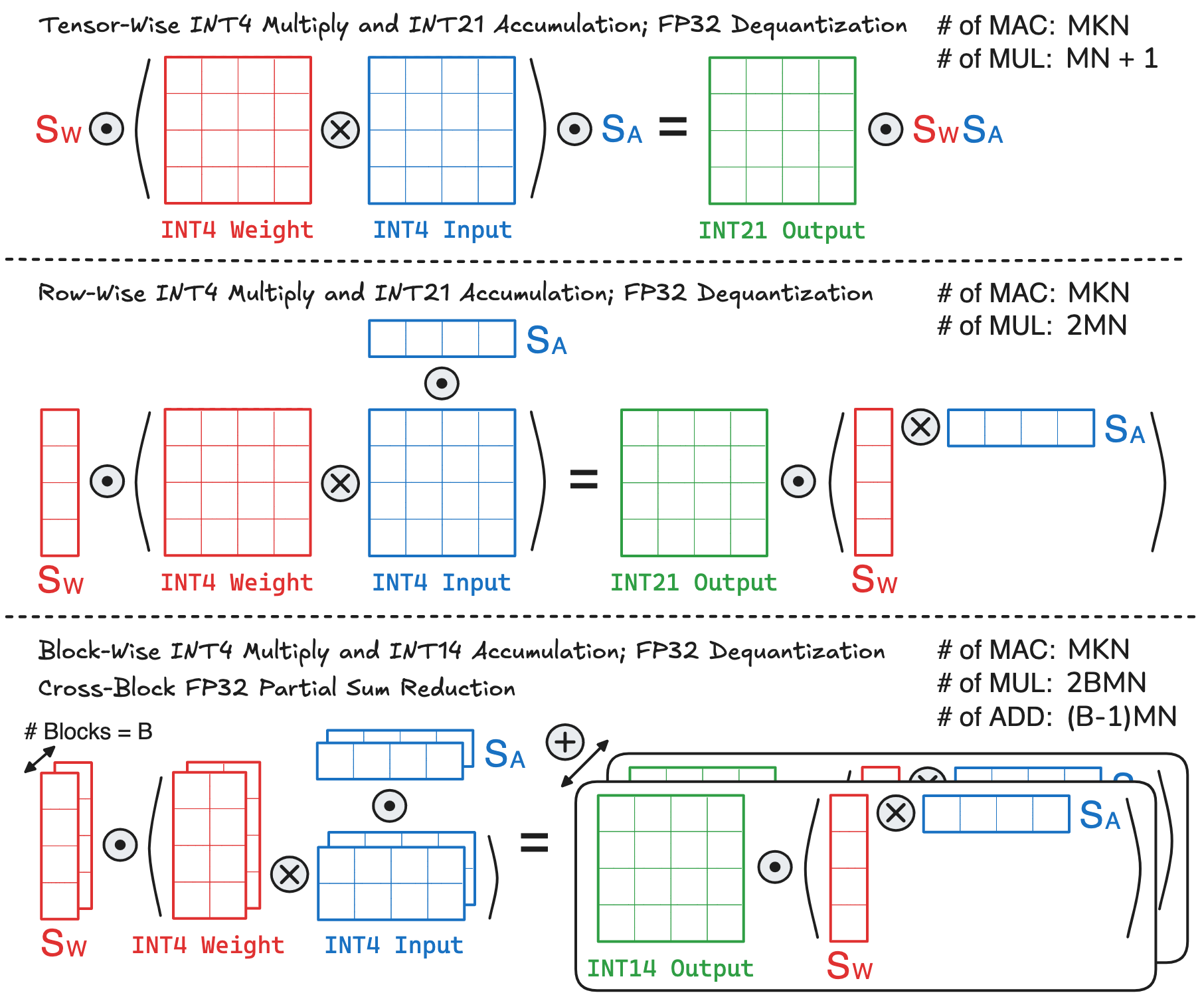 Algorithm-Hardware Trade-Off under Different Granularity: As discussed above, an obvious benefit of reduced quantization granularity is lower quantization error, which potentially offers better model accuracy. However, this algorithmic benefit comes with additional computation and memory costs. Below, I try to visualize the computation flow of performing a \(M\times K \times N\) GEMM under different INT4 quantization granularity: