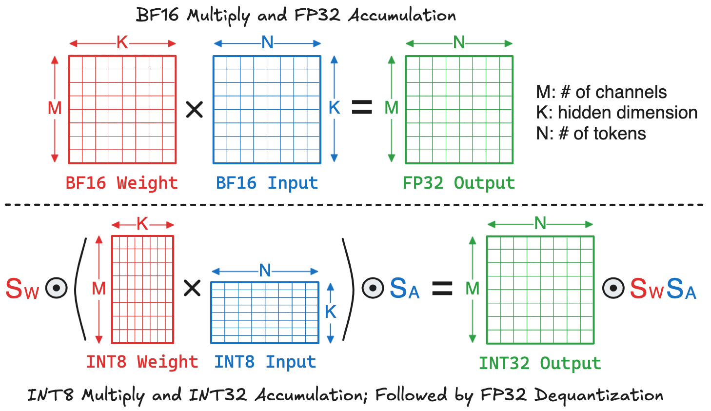 By reducing the operand bit-width, quantization not only decreases the memory footprint, but also enables more efficient computation using low-precision MAC hardware. When the baseline LLM stores model weights and input activations in BF16, its linear layer will perform a GEMM using BFP16 multiply and FP32 accumulation. As an example, if we employ per-tensor quantization to convert model weights and input activations to INT8, the linear layer can instead perform a GEMM using INT8 multiply and INT32 accumulation, followed by dequantization that multiplies the output matrix with two scale factors. This is visualized below: